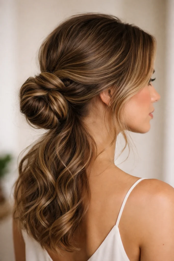 Not quite a full updo, not quite half-up—this style occupies a perfect middle ground. You’re gathering roughly half your hair from the crown and twisting it back into a knot that sits at the back of your head, leaving the bottom half of your wavy hair down. It’s the ideal style for days when you want hair off your face and neck but don’t want to commit to a full updo. It’s also surprisingly secure for how loose and undone it looks.