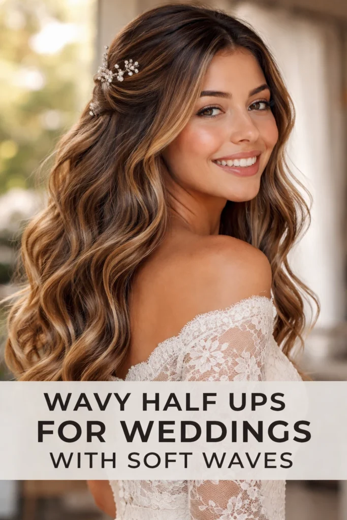 Let’s explore twenty stunning wavy half-up styles that each bring something different to a wedding day—some emphasizing texture and bohemian romance, others leaning into glamorous elegance, and many striking that perfect balance between both.
